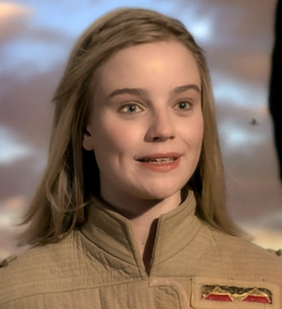 In the miniseries, Romana has long blonde hair, white skin, and blue eyes. She strictly wears her Skybax cadet uniform.[1]
