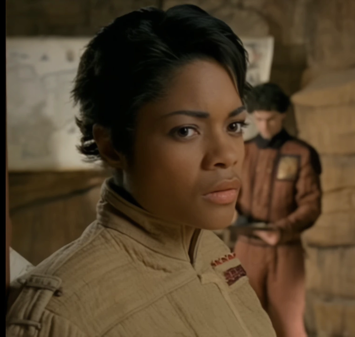 In the TV series, Romana has short dark hair, light black skin, and brown eyes. She strictly wears her Skybax cadet uniform.[2]